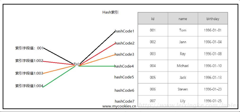 基于哈希表实现,只有精确匹配索引所有列的查询才有效,对于每一行数据,存储引擎都会对所有的索引列计算一个哈希码(hash code),并且Hash索引将所有的哈希码存储在索引中,同时在索引表中保存指向每个数据行的指针。