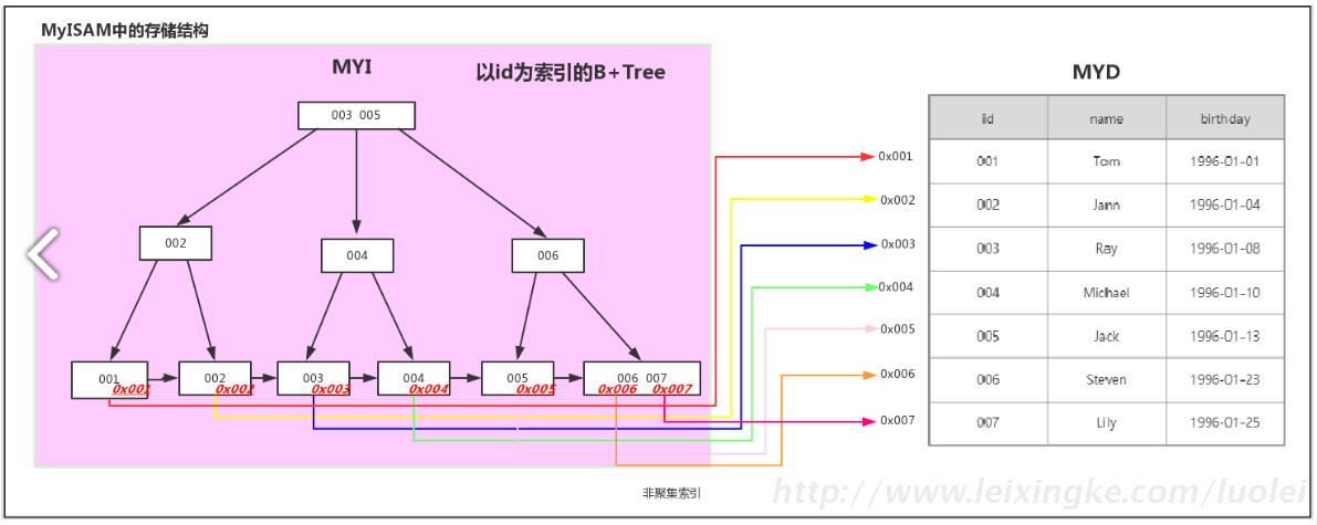 在MyISAM引擎中的实现(二级索引也是这样实现的)