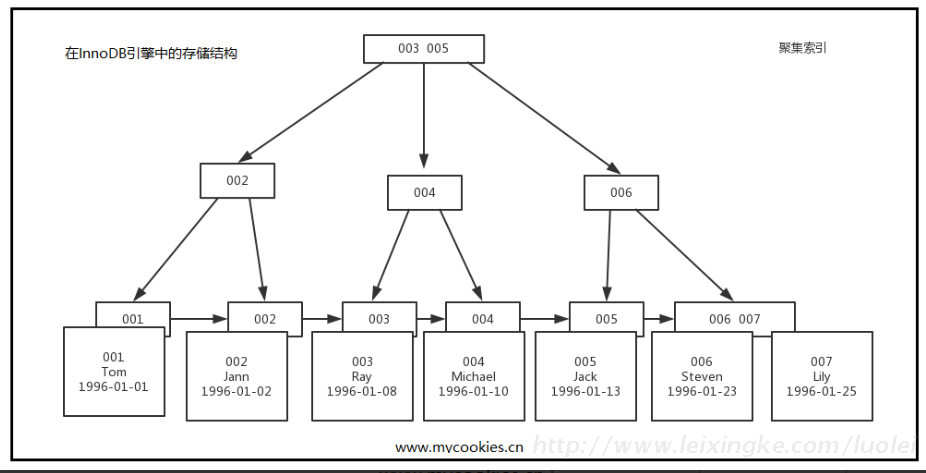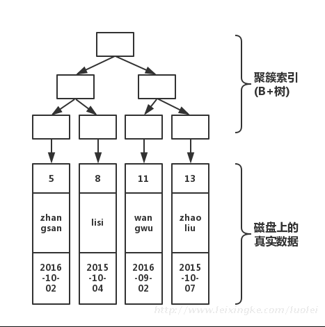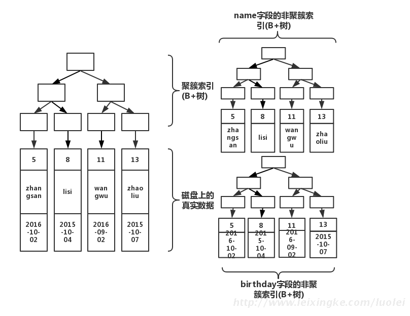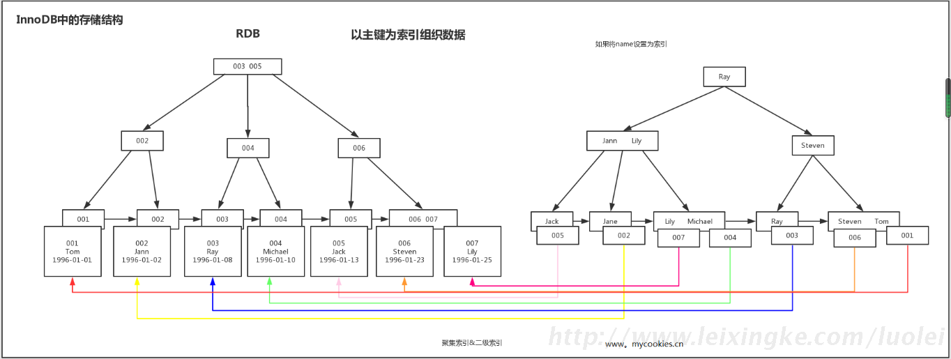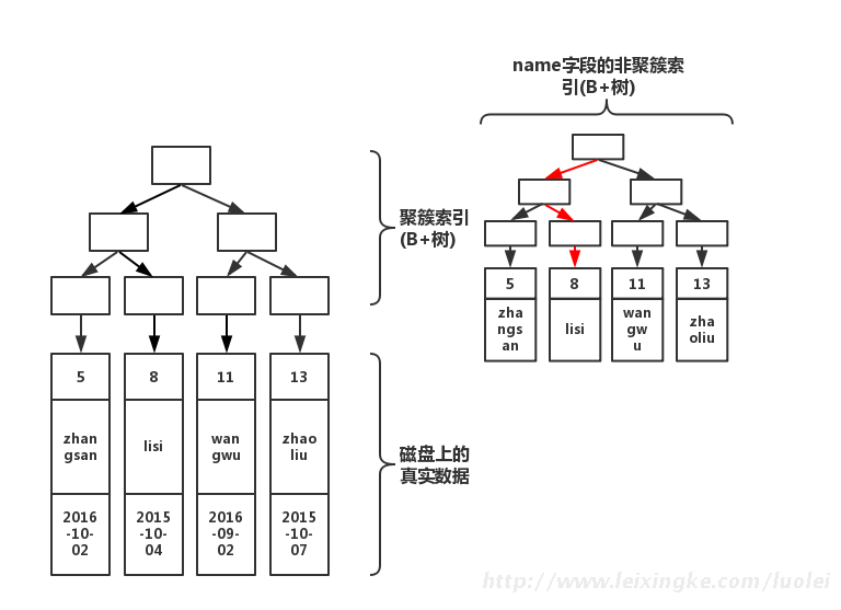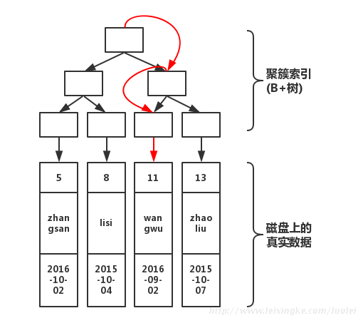 通过上图红线可以看出,先从非聚簇索引树开始查找,然后找到聚簇索引后。根据聚簇索引,在聚簇索引的B+树上,找到完整的数据!
