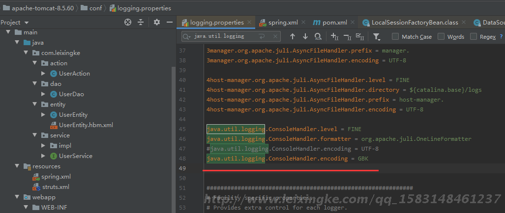 修改 tomcat 下的 config/logging.properties 这个文件为 endcodeing = GBK 就好了,配置如下