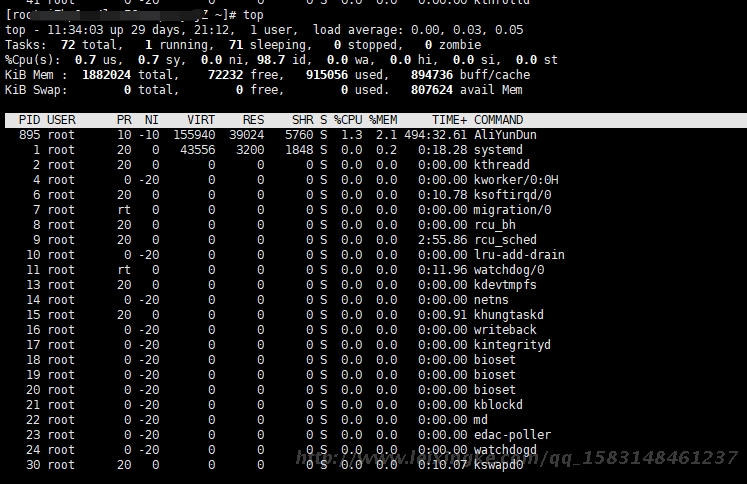 注:99.0 id,表示空闲CPU,即CPU未使用率,100%-99.0%=1%,即系统的cpu使用率为1%。